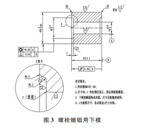 對(duì)應(yīng)于螺栓頭下圓弧 r,不論是冷鐓還是熱鍛,在螺栓實(shí)際生產(chǎn)過程中重點(diǎn)控制的應(yīng)該是螺栓鐓鍛用下模的 r,一是有意識(shí)加大 r 值,二是保證 r 圓弧過渡規(guī)范,而且 在模具加工過程中絕對(duì)不能出現(xiàn)扎刀現(xiàn)象(如圖 3)。