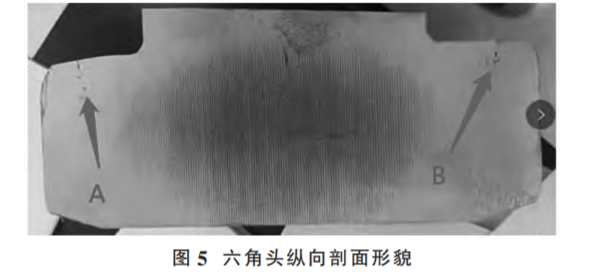 (2)原因分析。將該類問題螺栓六角頭縱向剖開,剖面如圖 5所示,在六角頭墊圈面邊沿的 A、B 處有明顯的裂紋,說(shuō)明螺栓六角頭墊圈面邊沿存在應(yīng)力集中,在淬火時(shí)形成裂紋,這種裂紋最終將導(dǎo)致螺栓掉頭。