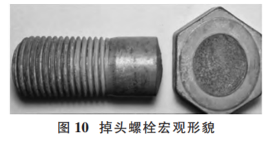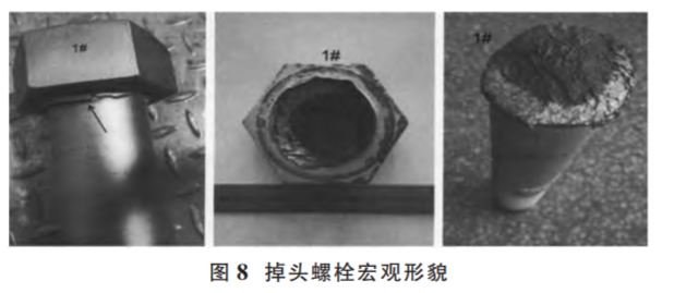 從實(shí)物拉伸試驗(yàn)結(jié)果看,斷裂全部發(fā)生在螺紋部 位,而且抗拉強(qiáng)度全部符合 GB/T 3098.1—2010 標(biāo)準(zhǔn)規(guī)定,說(shuō)明螺栓掉頭并不是螺栓本身質(zhì)量問題所致。當(dāng)然,考慮頭部變形,使用了塑性比較好的 08Al 材料,這與實(shí)物拉伸試驗(yàn)抗拉強(qiáng)度較低相吻合。