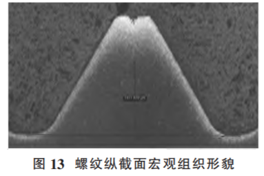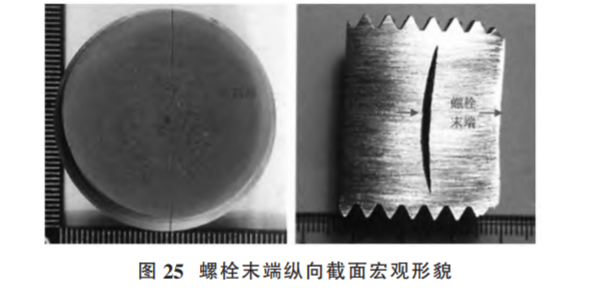 圖25為斷裂螺栓末端縱截面取樣位置及縱截面宏觀形 貌,可見在距離末端第 3 扣螺紋對(duì)應(yīng)位置內(nèi)部存在橫向裂紋。